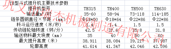 二.TH系列斗式提升機是一種常用的提升設備,該系列斗式提升機采用鍛造環鏈作為傳動部分,具有很強的機械強度,主要用于提升機粉體和小顆粒及小塊狀物料,區別于TD系列斗式提升機,其提升量更大、運轉效率更高。其常用于較大比重的物料的提升。TH系列斗式提升機主要技術參數參考圖: